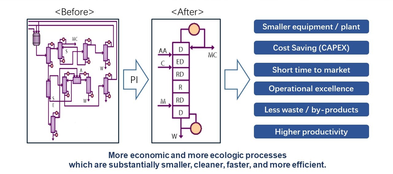 沈?yàn)t博士指出,與放大生產(chǎn)規(guī)模的思路相反,強(qiáng)化工藝是指在更小的反應(yīng)器里通過工藝優(yōu)化去實(shí)現(xiàn)更高質(zhì)量的目標(biāo)產(chǎn)物,這其中不僅是工藝規(guī)模的減少,還包括時(shí)間與費(fèi)用的成本降低。強(qiáng)化工藝可以提高運(yùn)營效率,加速藥物研發(fā)進(jìn)度。