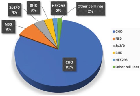 CHO細(xì)胞是最常用的宿主細(xì)胞,從1987 年到20212月,通過培養(yǎng)的哺乳動物細(xì)胞生產(chǎn)的獲批生物藥中有 81% 是使用CHO細(xì)胞生產(chǎn)。