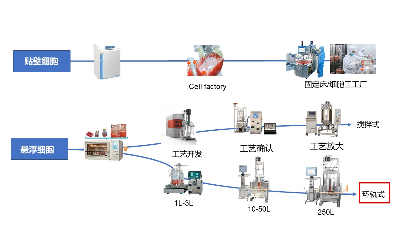 上游工藝平臺的選擇策略,需要從技術(shù)層面(遞送系統(tǒng)、宿主細(xì)胞類型等)以及非技術(shù)層面(項(xiàng)目階段、目的以及法規(guī)、商業(yè)價值等)考慮。以病毒載體為例,除固定床反應(yīng)器/細(xì)胞工廠以及攪拌式細(xì)胞培養(yǎng)以外,高騰生物的放大工藝亮點(diǎn)在于環(huán)軌式懸浮細(xì)胞培養(yǎng)技術(shù),最大體積培養(yǎng)可高達(dá)2500L,可減少攪拌式培養(yǎng)帶來的剪切力,適應(yīng)范圍廣。