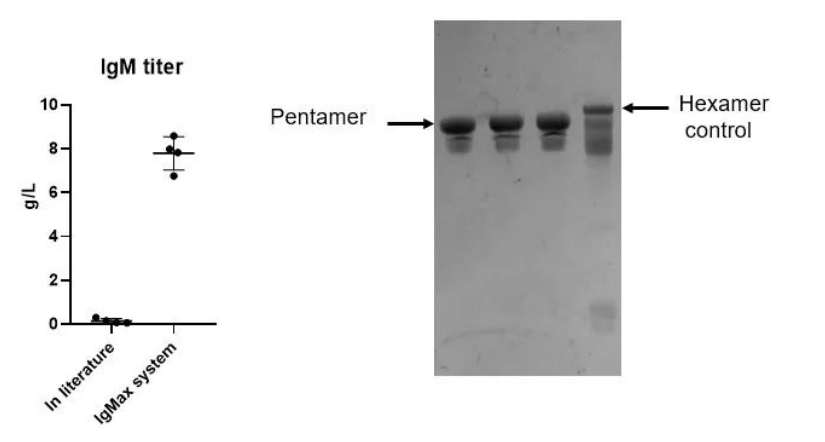 漢騰生物具備高表達IgM的經(jīng)驗,經(jīng)過載體系統(tǒng)改進及生產(chǎn)工藝的優(yōu)化后可提高lgM表達量,最高可達8g/L。其中,IgMaxTM表達載體平臺和IgMasterTM工藝平臺是漢騰生物自主研發(fā)的IgM相關(guān)開發(fā)平臺,其具備了高產(chǎn)量、高純度和高效價的特點,技術(shù)轉(zhuǎn)移路線清晰,可滿足大規(guī)模生產(chǎn)的需求。此外,理化分析、生化分析、制劑開發(fā)和生產(chǎn)能力也均配套完善,可有效解決IgM的產(chǎn)業(yè)化難題。