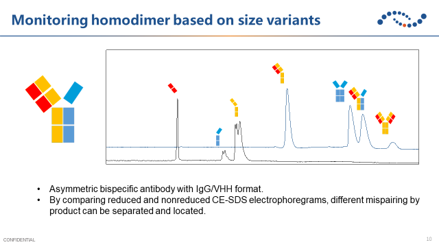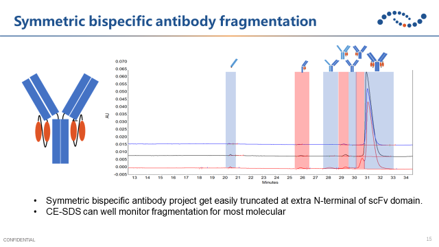 對稱性抗體通過鏈接亞基來實現(xiàn)雙特異性,但容易出現(xiàn)共價結(jié)合的聚集體或者在亞基上發(fā)生的斷裂。因此需要在工藝研發(fā)過程中重點關注聚集體和碎片,例如使用毛細管凝膠電泳監(jiān)控碎片。