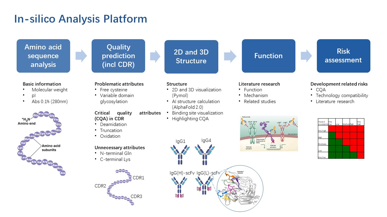 In-silico分析可基于序列、多種數(shù)據(jù)庫、結(jié)構(gòu)預(yù)測(cè)模型和平臺(tái)經(jīng)驗(yàn),為CMC研究提供詳實(shí)的理化參數(shù)(如pI、消光系數(shù)、分子量、二硫鍵、疏水性、糖基化位點(diǎn)、N-/O-糖型等)和潛在產(chǎn)品相關(guān)雜質(zhì)(如氧化、脫酰胺、聚集、斷裂、高級(jí)結(jié)構(gòu)異質(zhì)等)。