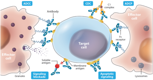 一般IgG類抗體產(chǎn)生作用是通過ADCC (Antibody-Dependent Cell-mediated Cytotoxicity)、ADCP (Antibody-Dependent Cellular Phagocytosis) 和CDC (Complement-Dependent Cytotoxicity) 作用機(jī)制,如圖1所示。