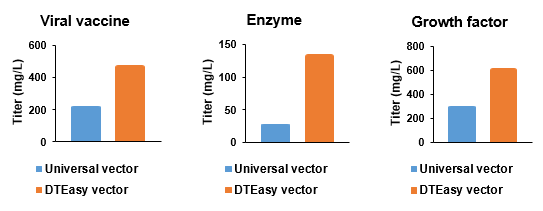 對于培養(yǎng)過程中對細(xì)胞產(chǎn)生一定壓力的蛋白,通過添加劑增加細(xì)胞耐受也可以提升表達(dá)量。DTEasy專有添加劑可只需在培養(yǎng)過程中簡單的單次添加,即可最高提升3倍表達(dá)量。