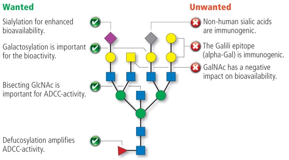 GlycoExpress® (GEX®)細胞系可賦予天然蛋白、抗體、融合蛋白等多種重組生物大分子蛋白復(fù)雜的人源糖基化特征,從而降低非人源糖基化特征的負面影響,滿足復(fù)雜糖蛋白的臨床開發(fā)需求。同時利用細胞工程、生物信息學(xué)、系統(tǒng)生物學(xué)及合成生物學(xué)技術(shù),開發(fā)出SIALOMAX®、FUCOFLEX®、SIALOFLEX®三種專門針對唾液酸、巖藻糖和甘露糖修飾調(diào)節(jié)的細胞系,對于所表達的目標(biāo)蛋白可達到延長半衰期、增強活性、增強ADCC效應(yīng)等效果。
